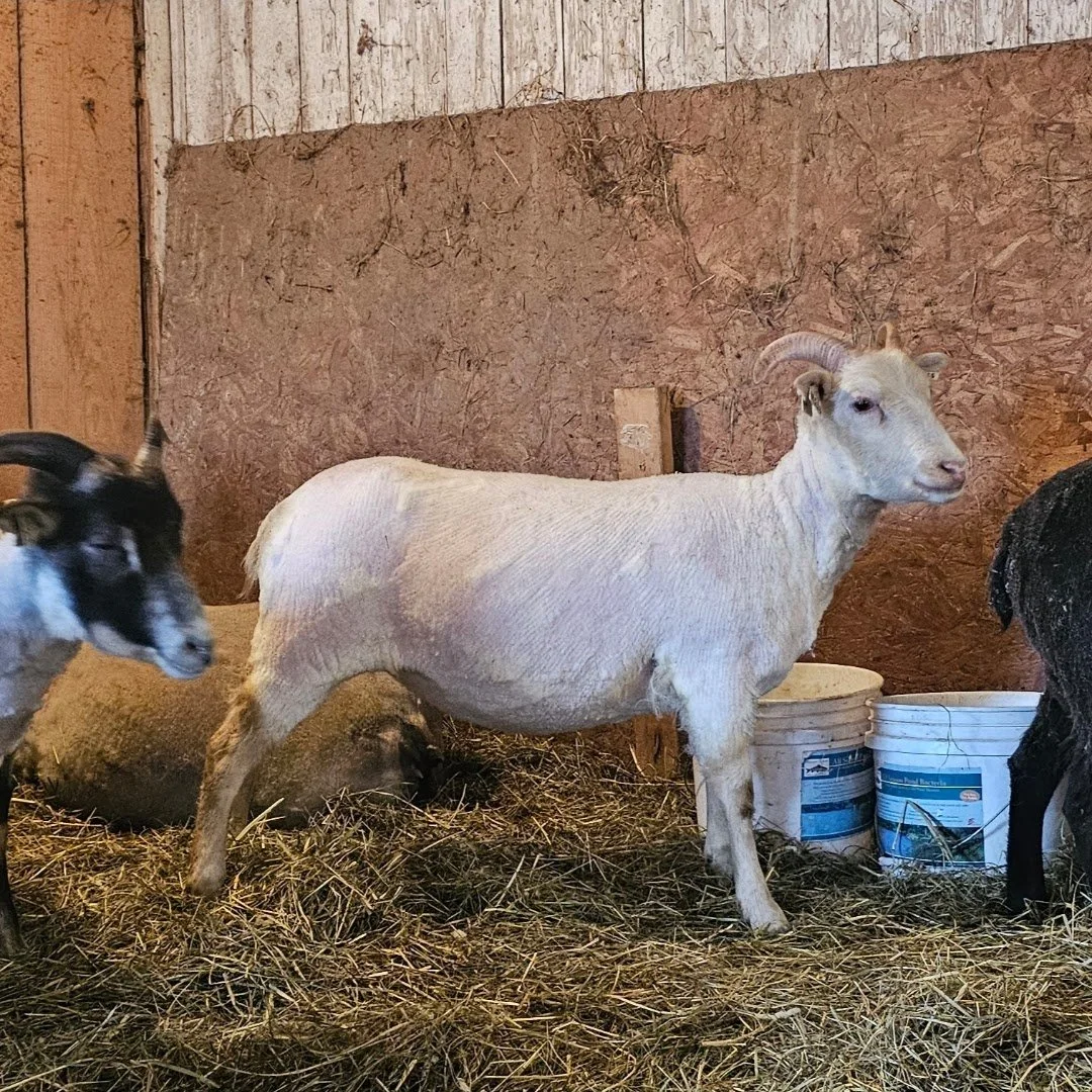 Asa is a heterozygous white triplet out of Kind Horn Farm, sired by AI Askur. We’re very excited to have genetics from this new AI sire! Beautiful ewe with a wide, muscley conformation. She’ll be held over for breeding until 2025.
